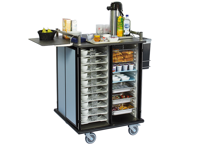 High individuality in food distribution with less food waste? No problem with the Mobis Buffetcart from Hupfer. The ergonomic buffet trolley has everything on board that is needed for breakfast or dinner and keeps food cold efficiently with the patented N'ice & Easy cooling.